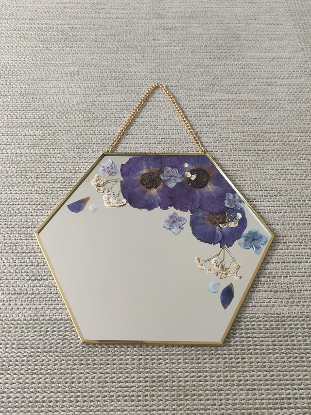 Miroir orné de fleurs pressées : anémones; gypsophiles, hortensia.